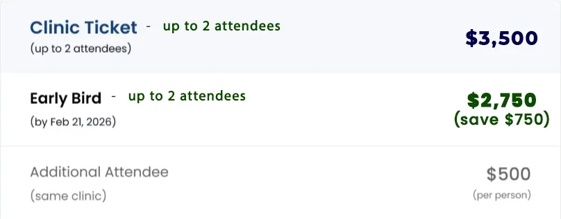 Your clinic ticket (up to 2 attendees) includes: